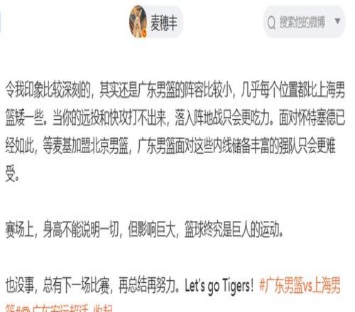 麦穗丰认为,广东队这场比赛就是输在了尺寸上:令我印象比较深刻的,其实还是广东男篮的阵容比较小,几乎每个位置都比上海男篮矮一些。当你的远投和快攻打不出来,落入阵地战只会更吃力。面对怀特塞德已经如此,等麦基加盟北京男篮,广东男篮面对这些内线储备丰富的强队只会更难受。赛场上,身高不能说明一切,但影响巨大,篮球终究是巨人的运动。