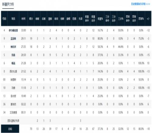 数据统计:吴冠希19分4篮板,纳托尔18分2篮板,劳森8分9篮板5助攻2抢断,伊力福拉提6分2篮板4助攻,哈里斯6分5篮板2助攻,西尔扎提6分4篮板,杨芮3分3篮板,李炎哲2分6篮板,冯傲2分。